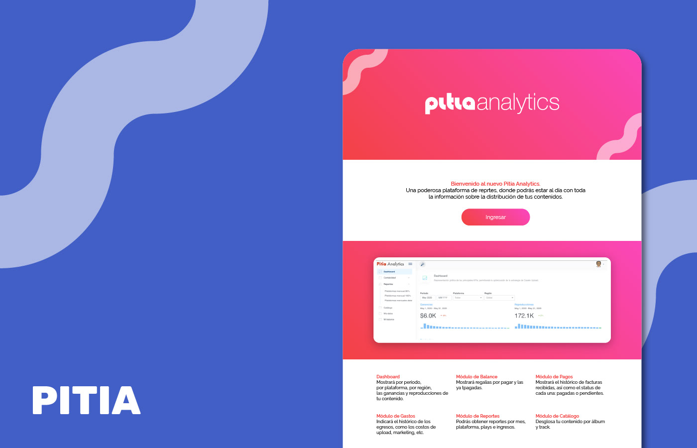 Acompañamos en el desarrollo tecnológico de las plataformas de distribución utilizadas en la empresa como PITIA, donde el artista puede hacer upload de sus contenidos para distribución y revisar posteriormente métricas e ingresos.